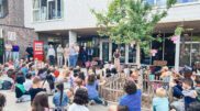 De overtollige grond die de graafwerkzaamheden met zich meebrengen wordt gebruikt om een mini-amfitheater te bouwen op de speelplaats. De speelplaats krijgt ook een groenzone met klimbomen.
