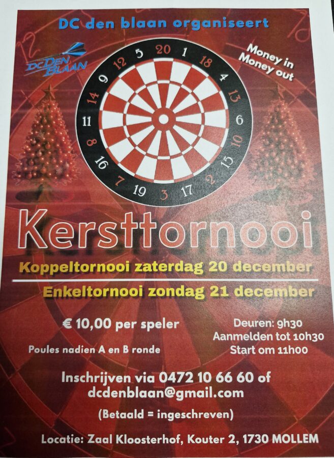 Tegen het eind van het jaar is er al opnieuw een toernooi van Den blaan. Op zaterdag 20 december is er het koppeltoernooi en een dag later, op zondag 21 december, mogen de individuele darters aan de bak. Dit alles gaat door in zaal Kloosterhof in Mollem. (eb)