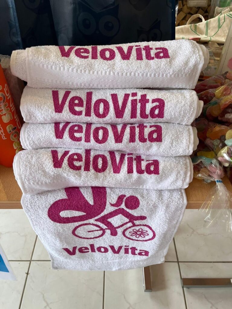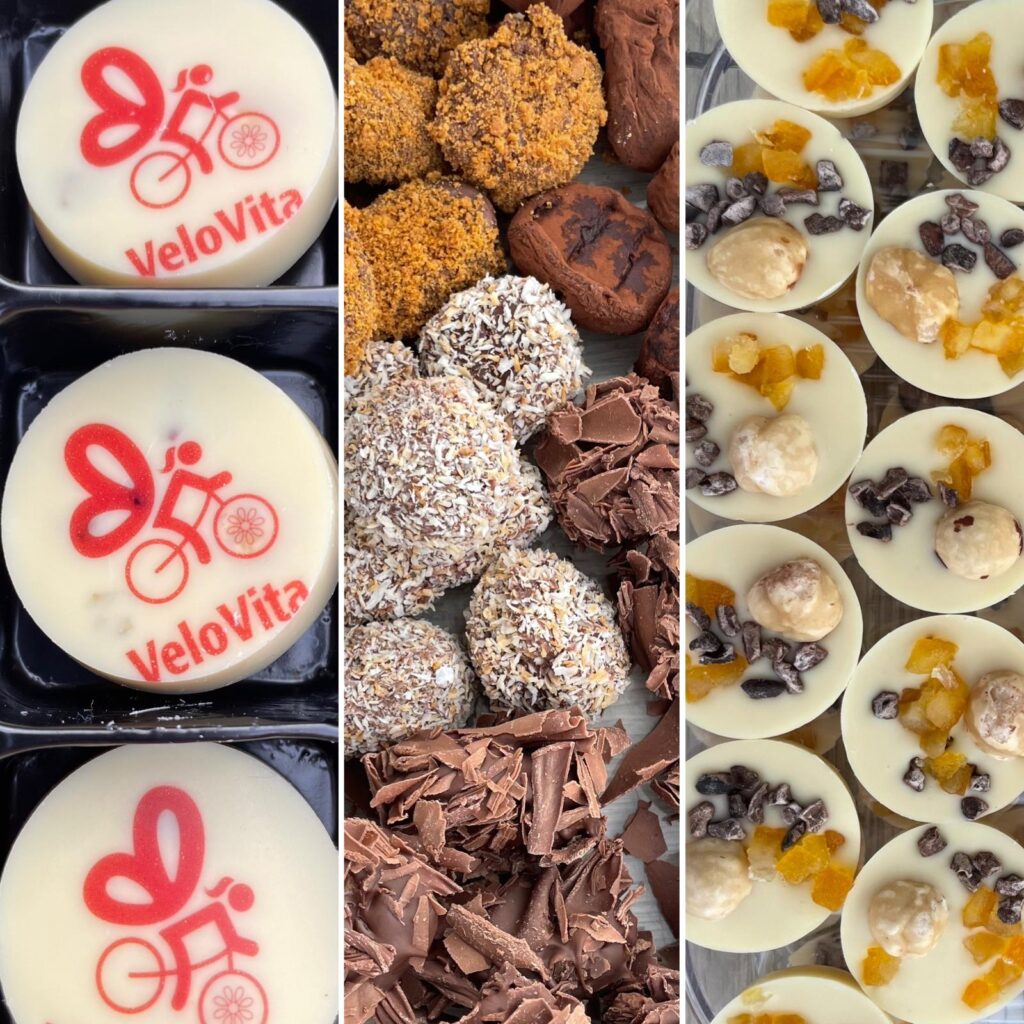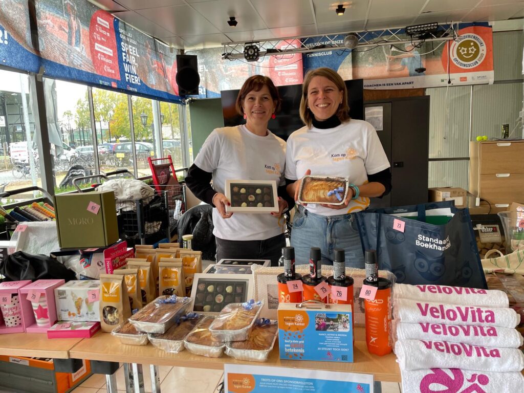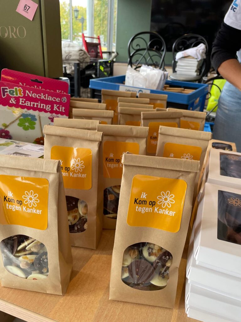 “Alida De Feijter, mijn moeder, is een creatieve duizendpoot,” vervolgt Astrid. “Ze stelt haar werken tentoon en verkoopt ze. Ideaal om langs te komen en een kerstcadeau te scoren! Op het gelijkvloers verkoopt team VeloVita pannenkoeken, gebak en lekkere drankjes. De opbrengst van het café en de verkoop van de werken is volledig ten voordele van Kom op tegen Kanker. Doorlopend verkopen we pralines, studentenhaver en truffels die door Frodolatier speciaal voor ons team ontworpen zijn.  Ook wijnen kunnen bij ons besteld worden.”