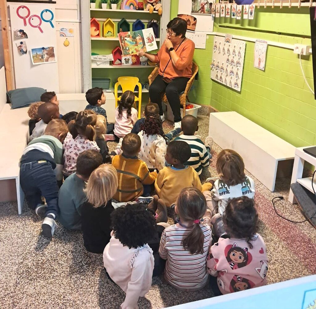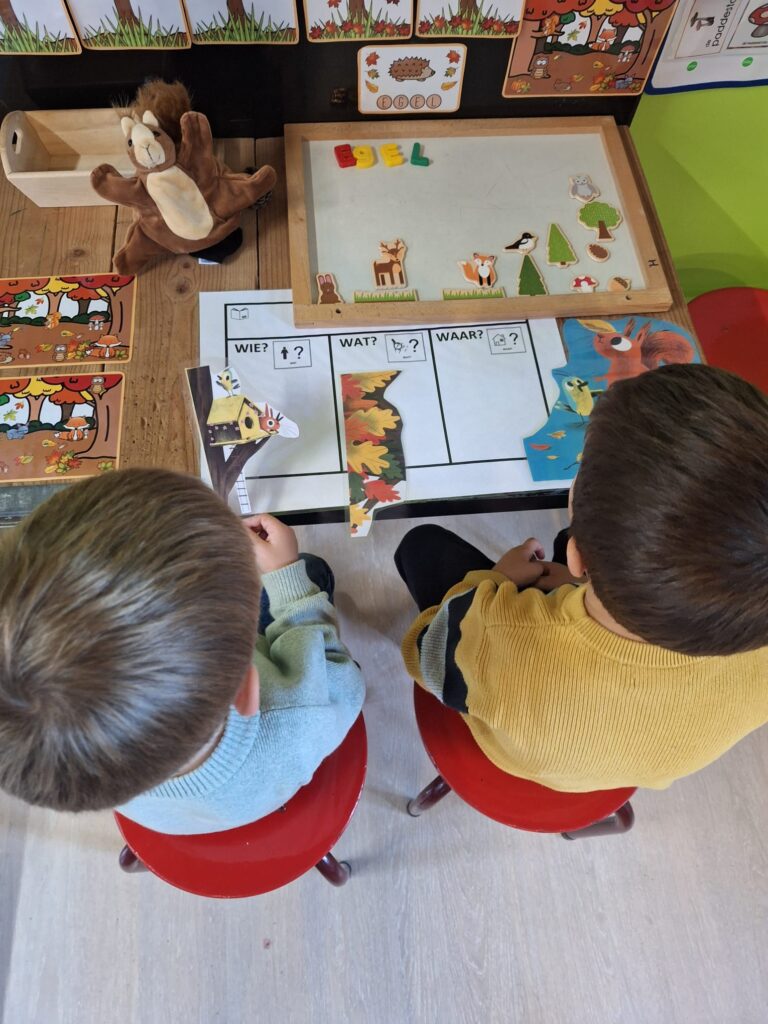 “Tijdens kleuterturnen oefenden we ruimtelijke begrippen. Dichteres Lisa Heyvaert kwam langs in het vijfde leerjaar om aan de slag te gaan met een voorwerp dat elke leerling meebracht. We dachten na over poëzie. Een schimmenspel over de Gruffalo in de 3de kleuterklas zette de verbeelding aan het werk. Daarnaast luisterden de kinderen ook naar een prentenboek.