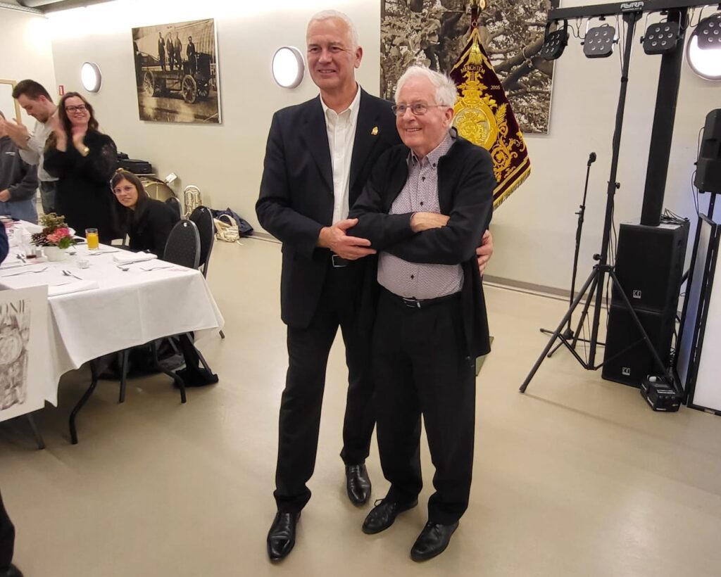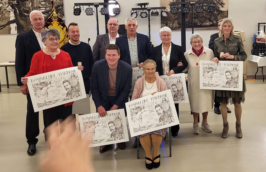 Alvorens de lijst te overlopen mag er toch even stil gestaan worden bij de prestaties van Jan Janssens voor 60 jaar musiceren en Jef Bogaerts (94) voor zijn 80-jarig lidmaatschap van de muziekvereniging. Eens Harmonie, altijd Harmonie zeker! Een staande ovatie viel beiden te beurt en zij gingen samen met de andere laureaten op de foto.