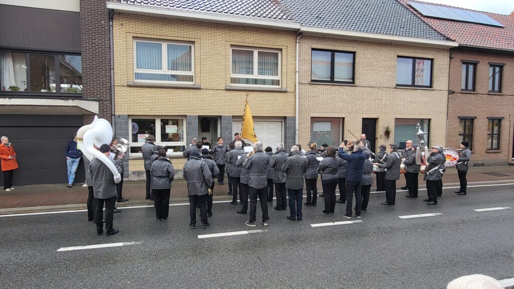 Eerste halte was de A. De Boeckstraat bij de jarige Arthur Latte. Hij was een dag eerder 100 jaar geworden en mocht in zijn deuropening van een mooie serenade genieten. Hij was meer dan een halve eeuw lid van de muziekmaatschappij. De buren kwamen meegenieten van de verrassingsmuziek en de kersverse honderdjarige genoot, samen met de familie, duidelijk van deze attentie.