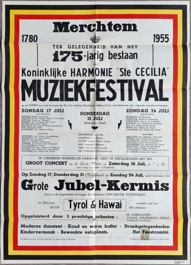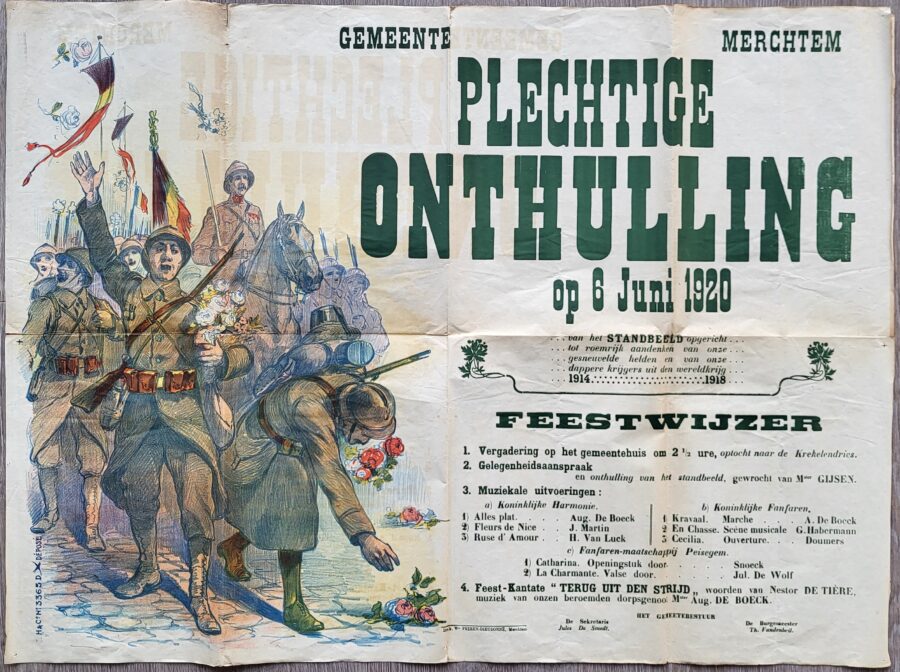 Tussen al dat materiaal vond ik ook al wat opmerkelijke zaken en dat maakt dit werk ook boeiend en leerrijk. Zo werd ik verrast door bedankingsbrieven van harmonieleden die waren gemobiliseerd tijdens WOII. Zij hadden een financieel steuntje gekregen van de harmonie. Er is ook de geweldige affiche van 1920 voor de inhuldiging van het standbeeld op Krekelendries.