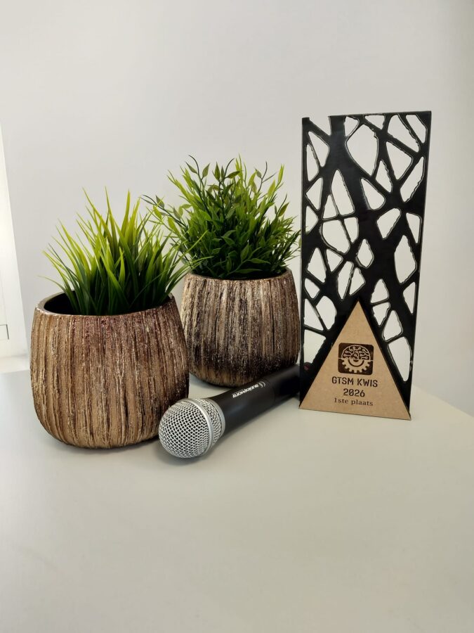 Buiten de vele mooie prijzen was er ook een unieke beker voor de winnaar. Met al de moderne technologie die GTSM in huis heeft werd die trofee gerealiseerd. Dit prachtstuk werd gewonnen door het team dat luisterde naar ‘Een zootje ongeregeld’. (eb)