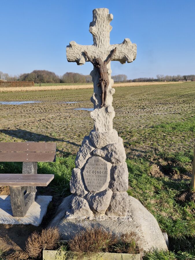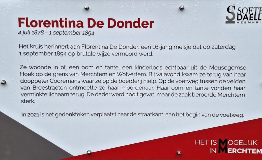 Het is precies als nieuw! Dat monument ter nagedachtenis van Florentina De Donder, een zestienjarig meisje dat in 1894 werd vermoord, was de laatste maanden fel in verval geraakt. Regen en wind hadden hun werk gedaan met enkele serieuze en minder grote scheuren tot gevolg. Een paar jaar geleden was het kruis ook al eens verplaatst geweest want het stond in feite tientallen meters van de straat, midden in het veld, waar ooit een voetweg was en de moord was gebeurd.