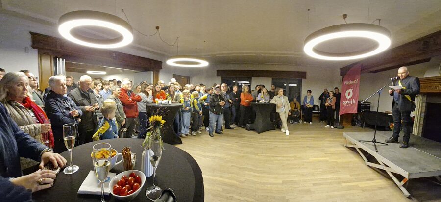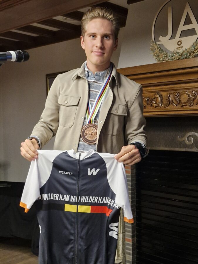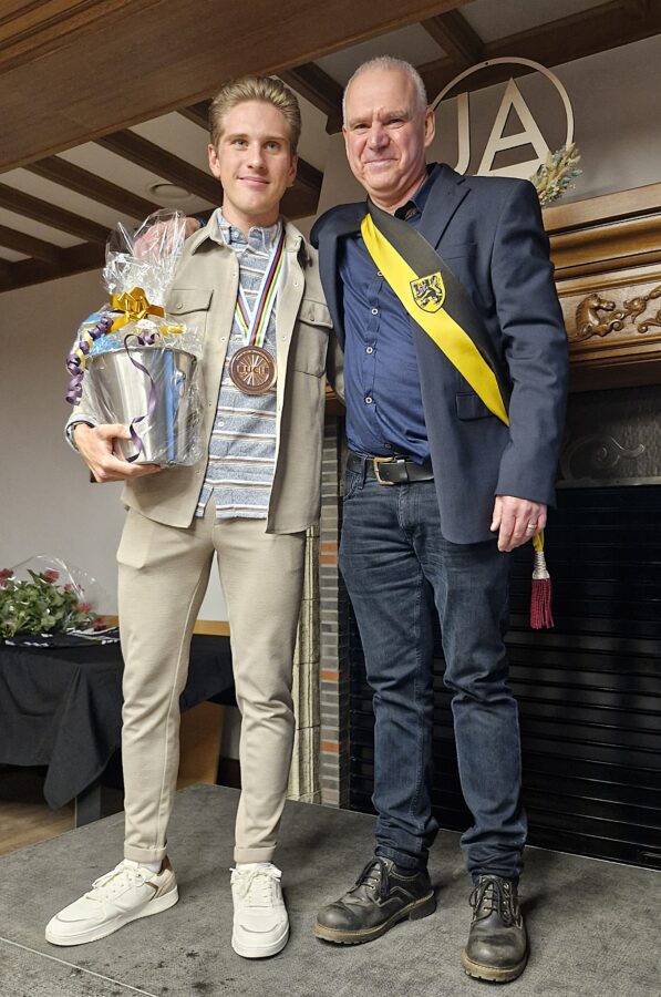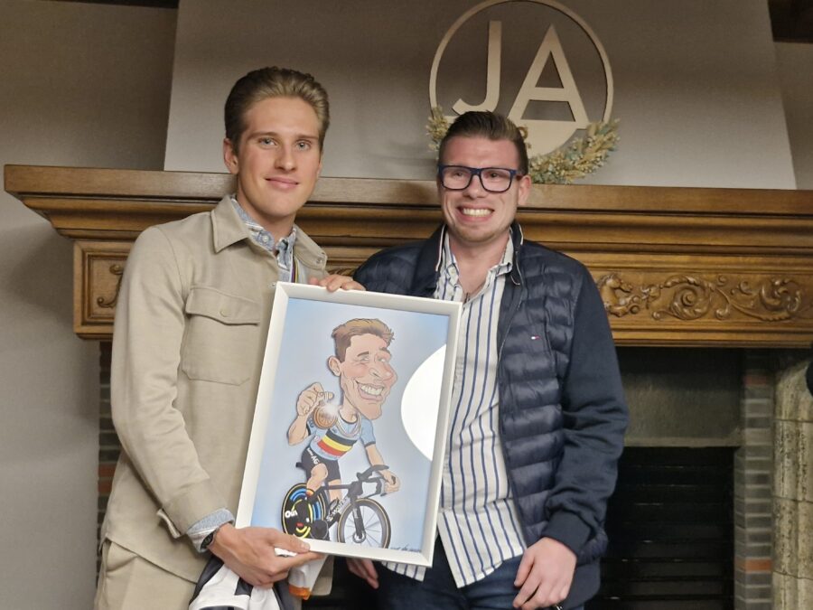 Daarna mocht ook Ilan het podium op. Hij dankte alle aanwezigen en merkte in al die drukte ook zijn buren op van Hulst en een jonge delegatie van CC1785, de wielerclub waarvan hij peter is. Nick Van Bever bedacht de tijdrijder met een cartoon en dorpsdichter Nele Bruynooghe vatte Ilan in een mooi stukje poëzie. En dan was het tijd voor foto’s, handtekeningen, een toast en uitgebreid nakaarten. (eb)