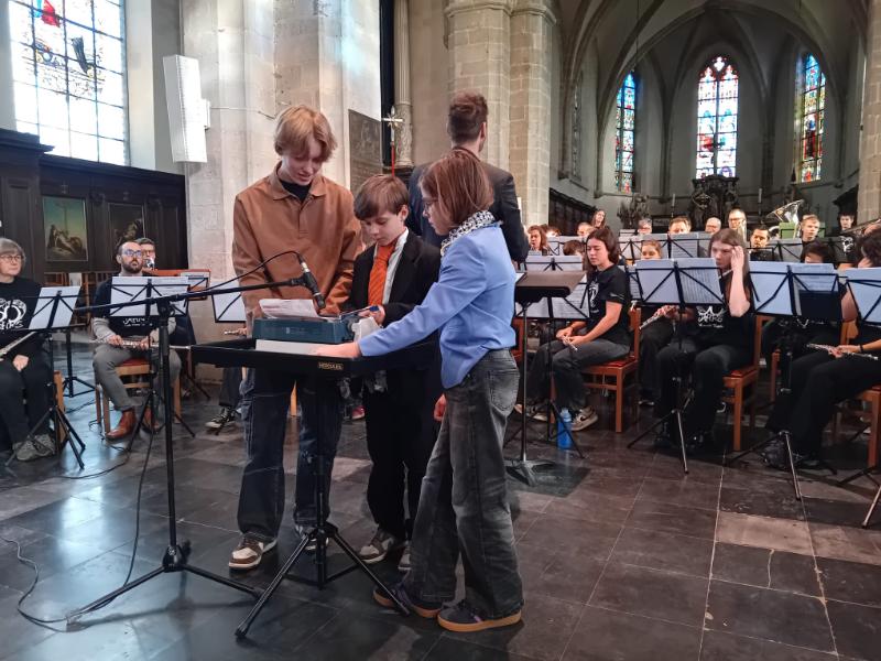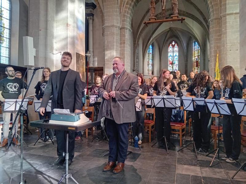 Een bijzondere rol was weggelegd voor slagwerkers Toon, Jarne en Lena van de Jeugdharmonie, die in ‘The Typewriter’ van Leroy Anderson bewezen dat je werkelijk overal muziek mee kan maken, zo ook met een ouderwetse typemachine. Dat kunstje hadden ze eerder ook al getoond in Merchtem een paar weken geleden, bij het duoconcert met Muzico.