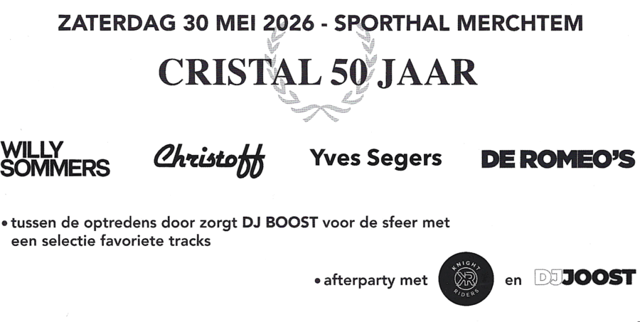 En niet te vergeten dat de Cristal Boys deze competitie aan hun vijftigste seizoen bezig zijn! Dat wil ook wat zeggen en dat wordt in 2026 met een tweedaags feest in de sporthal van Merchtem. Op vrijdag 29 mei is er een grote receptie en op zaterdag 30 mei wordt er groots uitgepakt met optredens van Willy Sommers, Christoff, Yves Segers en De Romeo’s. Daarna is er nog een afterpary met Knightriders en DJ Joost. (eb)