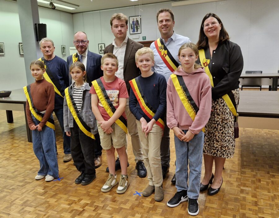 De raadzaal was goed volgelopen voor de eedaflegging van de kindergemeenteraad. Dat gebeurde al voor de 22ste keer. De nieuwe burgemeester mocht de spits afbijten en vervolgens was het de beurt aan Noé Van Hoeck (Ter Dreef), Sep Neirings (Sint-Donatus), Fay Ysebaert (De Plataan) en Tris Ronsmans (Ten Bos).