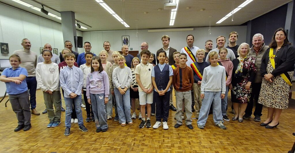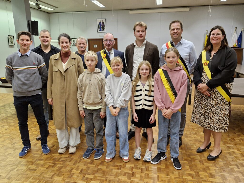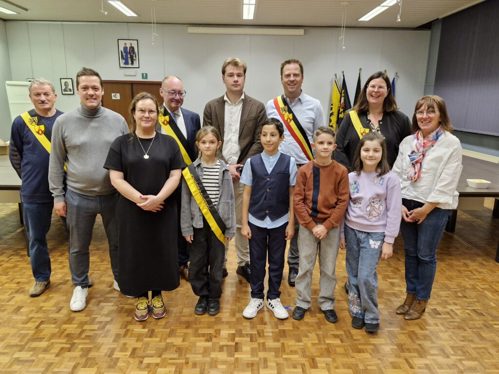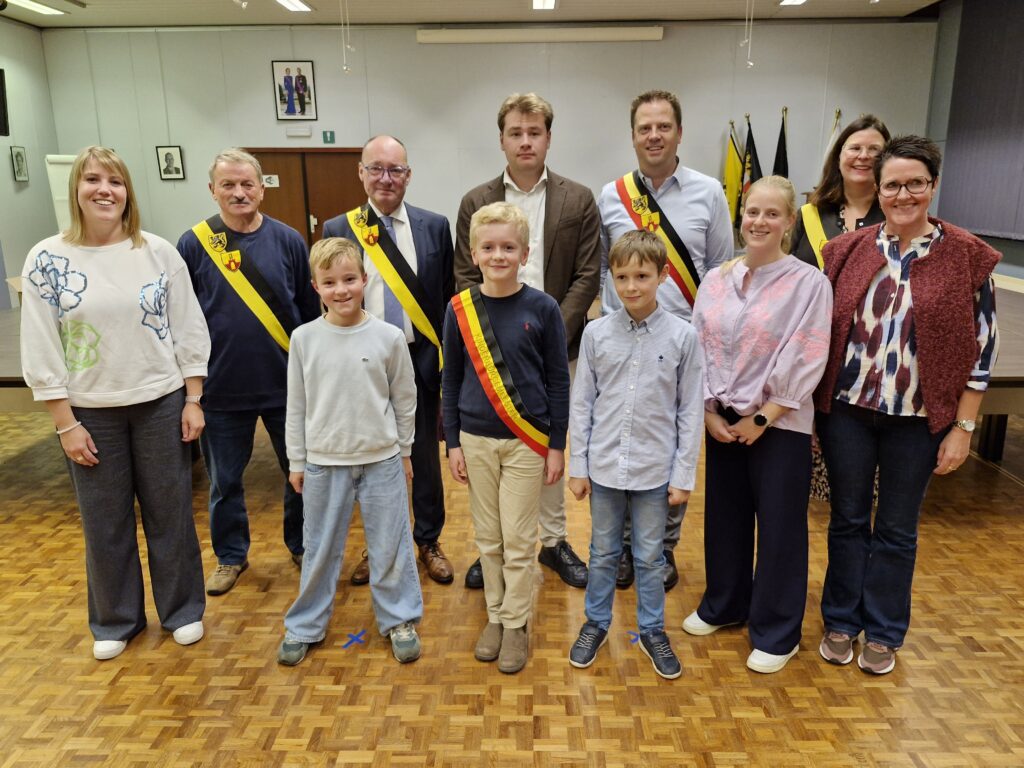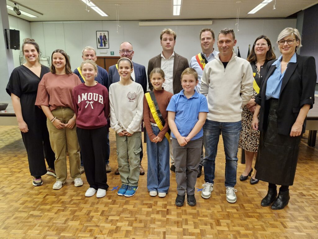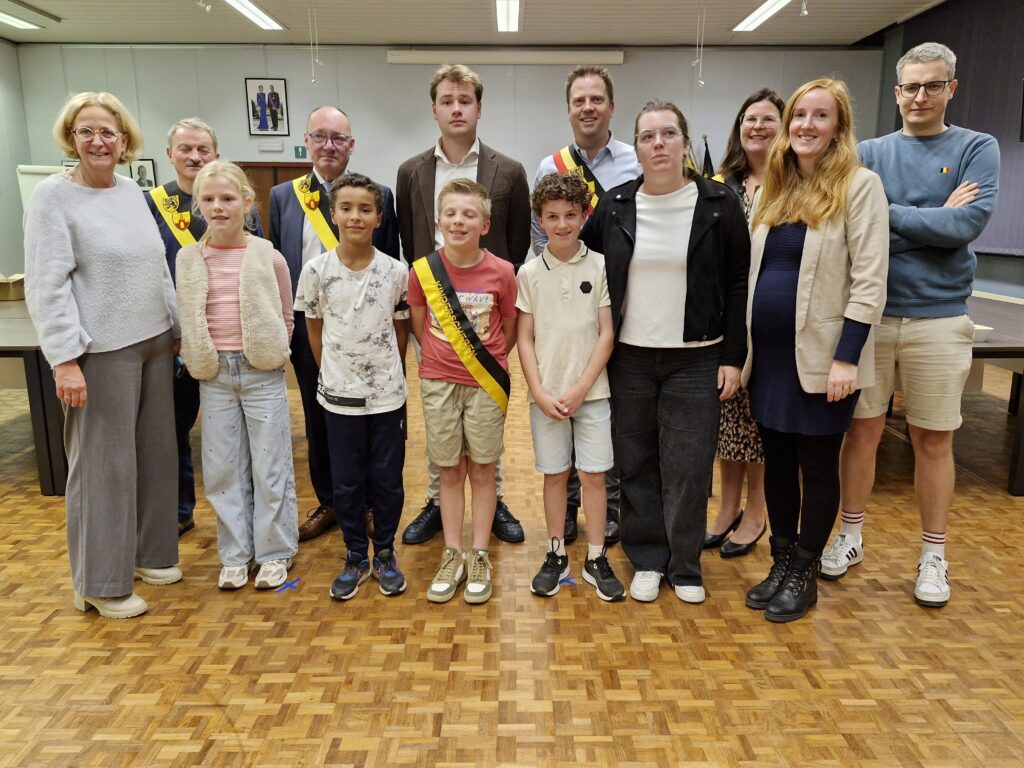 De raadzaal was goed volgelopen voor de eedaflegging van de kindergemeenteraad. Dat gebeurde al voor de 22ste keer. De nieuwe burgemeester mocht de spits afbijten en vervolgens was het de beurt aan Noé Van Hoeck (Ter Dreef), Sep Neirings (Sint-Donatus), Fay Ysebaert (De Plataan) en Tris Ronsmans (Ten Bos).