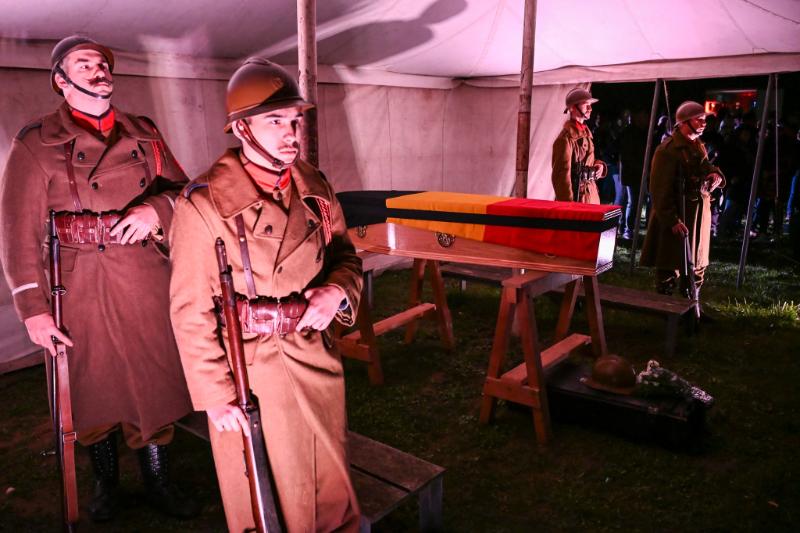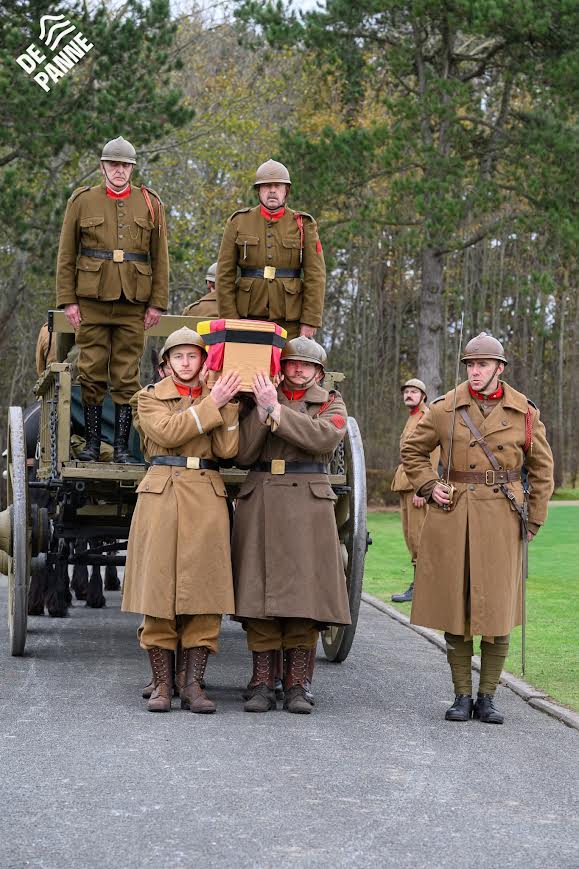 Een dag voor Wapenstilstand werd die gesneuvelde soldaat met de nodige eer begraven. Zelfs minister van Defensie Theo Francken was naar de kust afgezakt. De identiteit van de soldaat kon niet achterhaald worden. Het War Heritage Institute liet niets onverlet voor de plechtigheid. Ook De Piotten, een groep re-anactors, werden gevraagd om mee te werken.