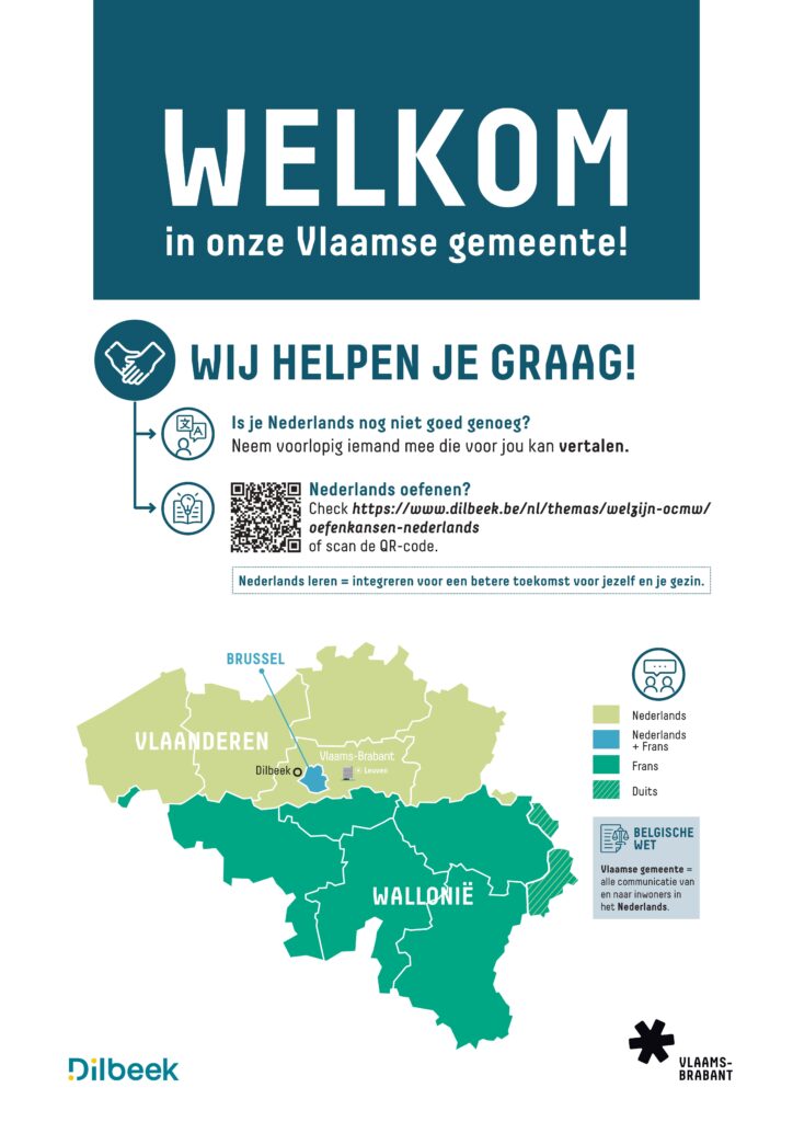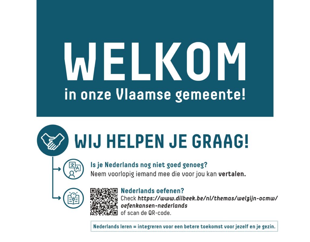 REGIO - Het personeel aan de loketten en in de openbare gebouwen van de gemeenten in Vlaams-Brabant ervaart de groeiende diversiteit van de bevolking in de dagelijkse werking. De pancarte ‘Welkom in onze Vlaamse gemeente’ nodigt anderstaligen uit om Nederlands te leren en te oefenen. Op woensdag 10 december werd het bord geplaatst bij de dienst Burgerzaken van de gemeente Dilbeek.