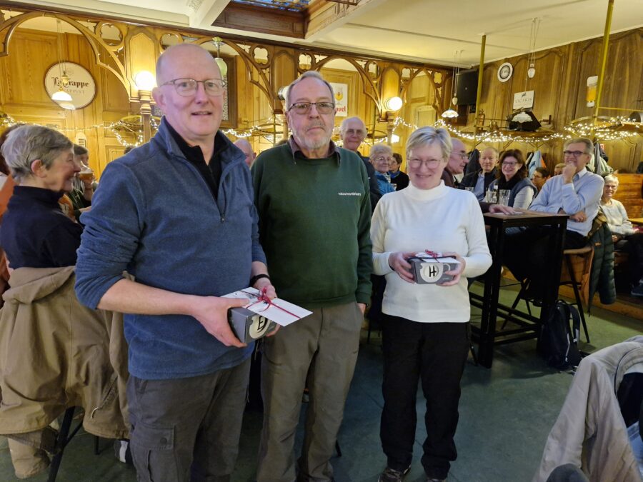 Na afloop werd er afgestapt in Goeste in Wies en mocht voorzitter Gilbert Roels de strafste wandelaars van de club in de bloemetjes zetten. Dat waren Hilde Van Gucht (Brussegem) en Eric Van Eeckhoudt (Merchtem) met allebei 21 wandelingen op hun conto van de 32 trips die er door Natuurwandelaars werden georganiseerd.