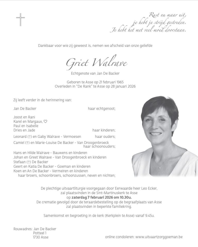 In de palliatieve zorgeenheid de Rank in Asse is woensdagochtend (28/01/26) Griet Walrave (21/02/1965) overleden na een slepende ziekte. Griet … Lees meer
